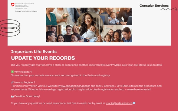 Living in the Philippines as a Swiss citizen? Don’t forget — you and your spouse or registered partner must report all civil status events and decisions to the Swiss Embassy in Manila. Stay connected, stay registered!